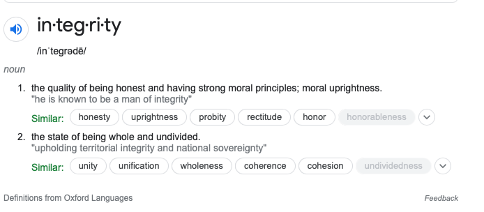 Being a person of integrity means we reflect on the outside, what is on the inside. Like an integer, we can be whole and complete. We are not perfect, but as the scripture says: